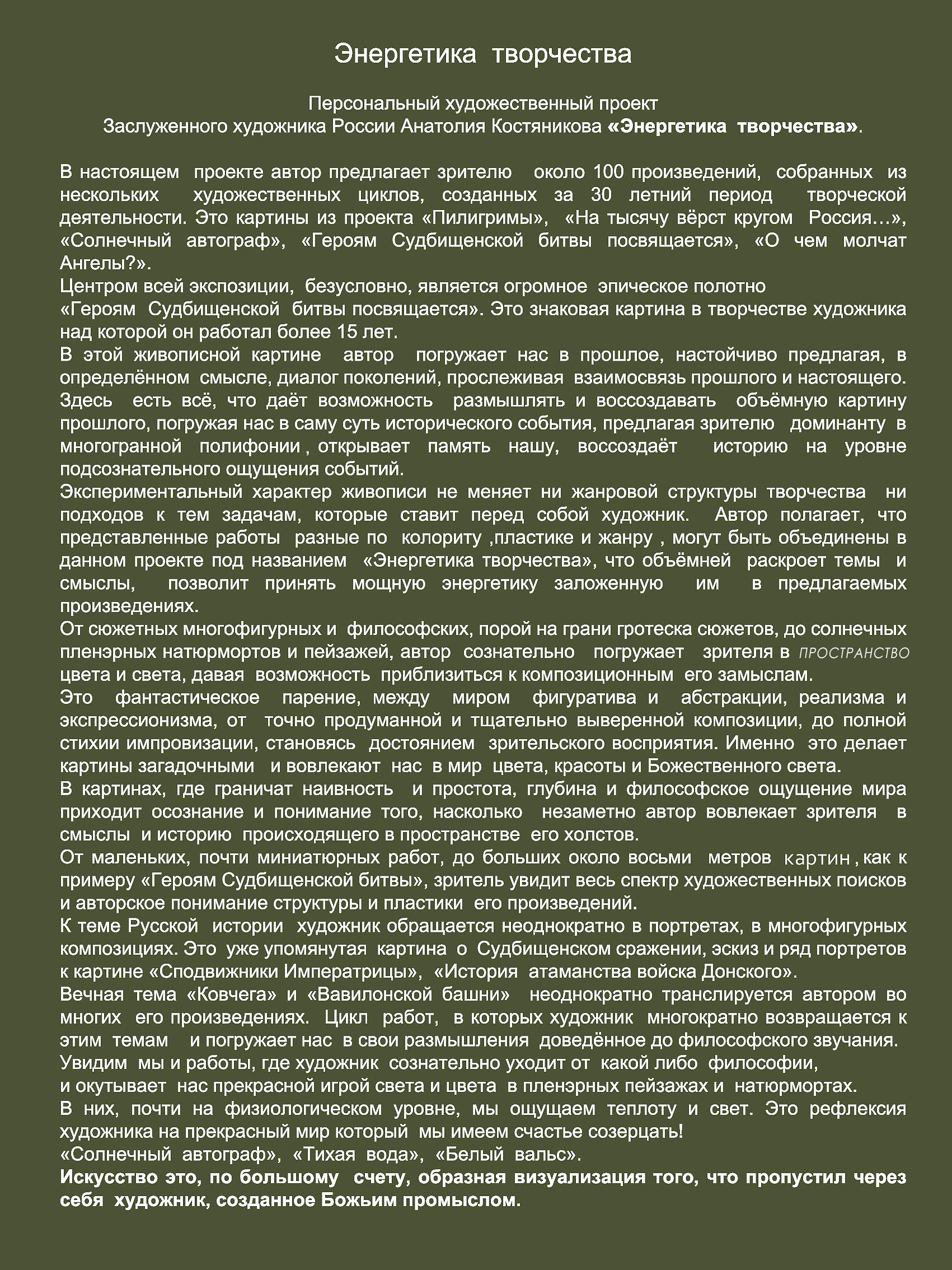 Заслуженный художник России, Почётный академик Российской академии художеств Анатолий Гаврилович Костяников представляет художественный проект Арт-история.