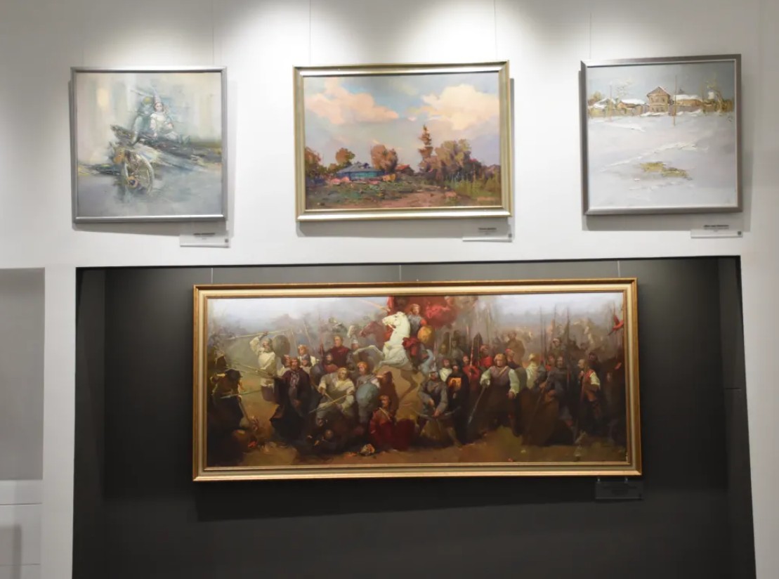 На выставке представлено более 100 произведений автора: от пленэрных этюдов, фигуративных композиций до знаковой его картины «Героям Судбищенской битвы посвящается», над которым художник работал с 2008 по 2015 год.