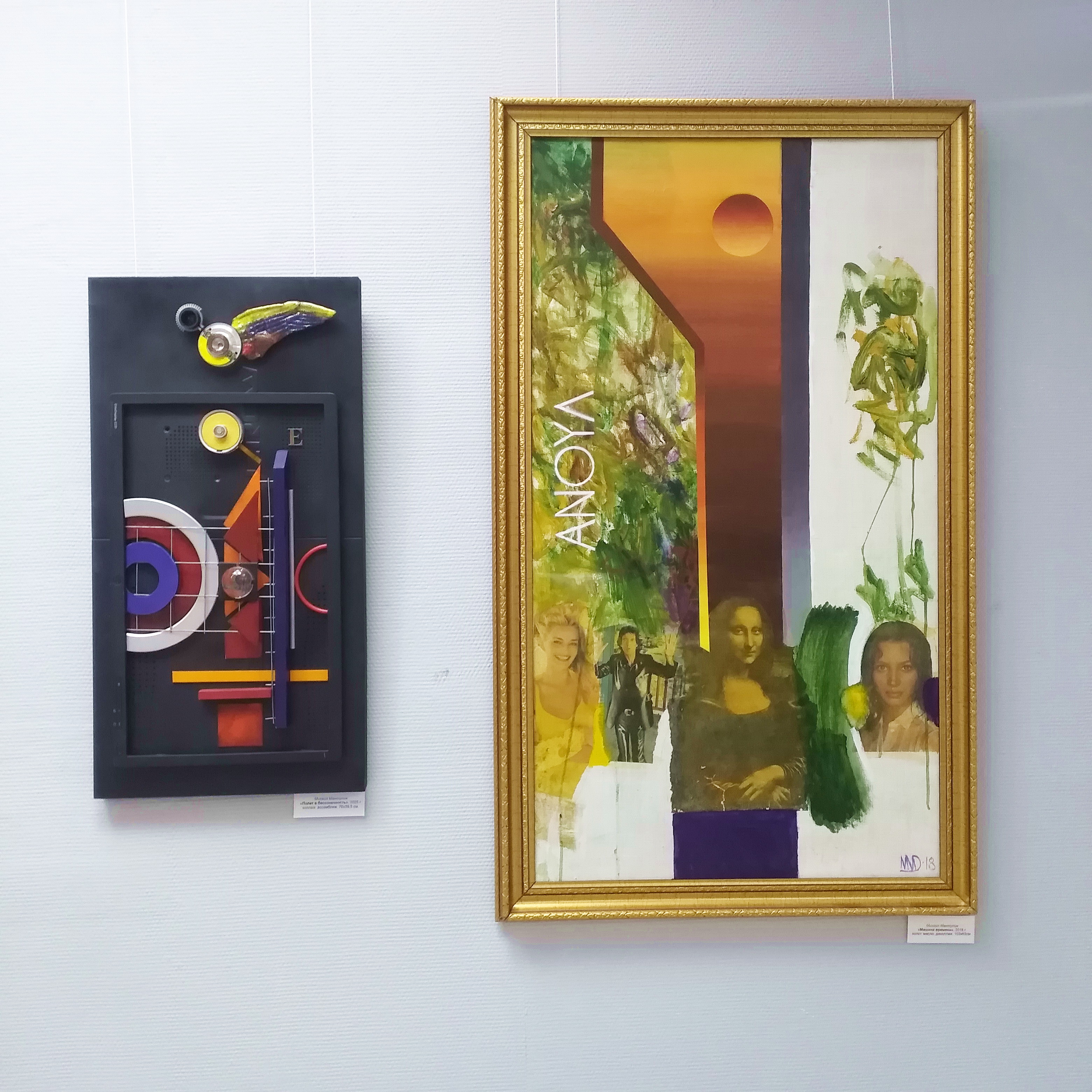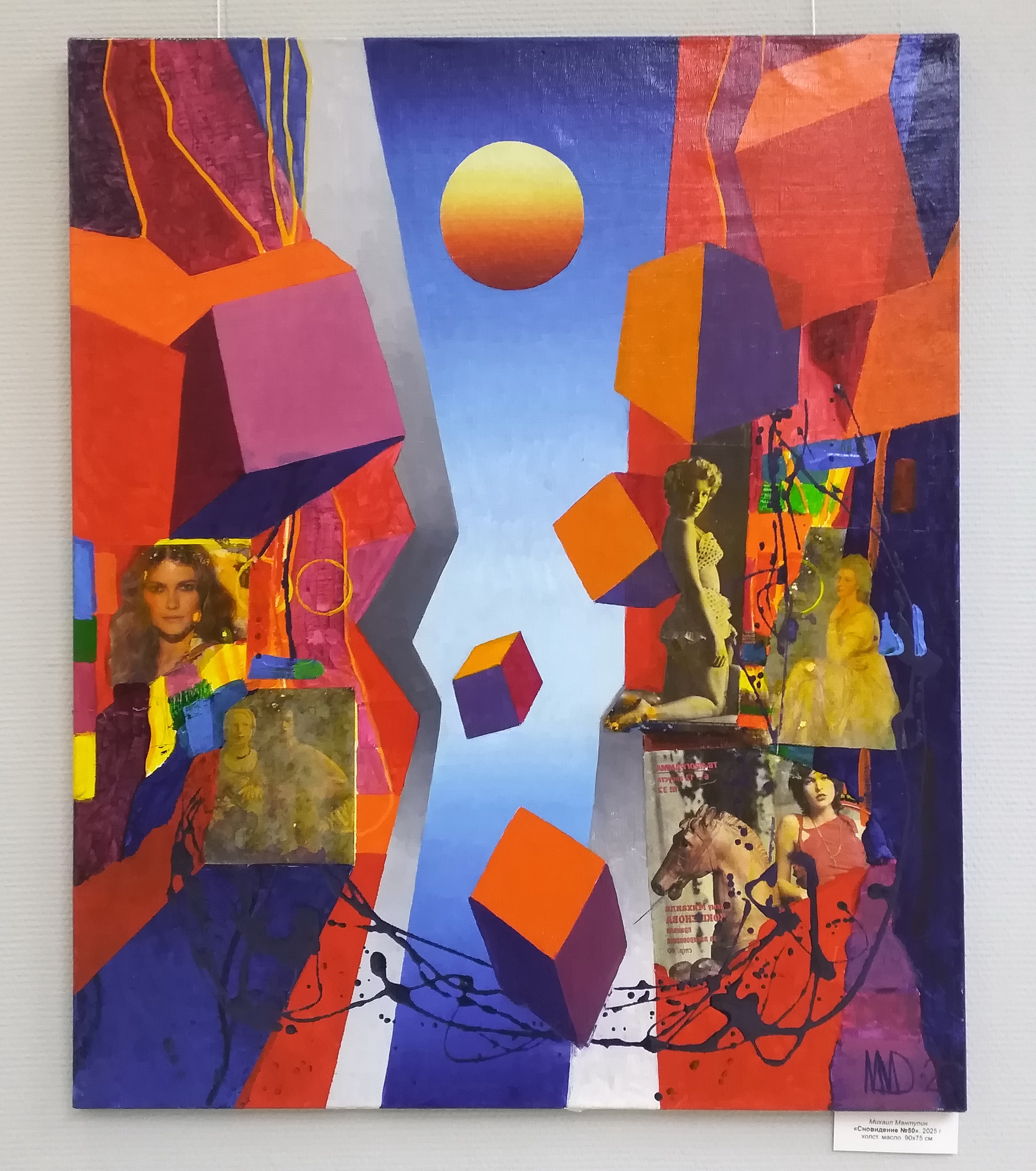 В картинах, над многослойной структурой композиции, часто присутствует мотив восходящей или заходящей, переливающейся мягким светом планеты. И эта планета ‒ точка отсчета бытия, символ рождения времени, пространства и материи. Планета в картинах художника «держит» поле картины, структурирует его. Часто художник конструирует свою Вселенную, включая в сложные композиции образы Эпохи Возрождения, фрагменты жанровых картин прошлых столетий. Легко, как в полете, отталкиваясь от материальности мира, художник углубляется в работу с формой, пятном, абстрактной композицией, вновь возвращается к классическим образам. Например, в картине «Сновидение №45», представленной на выставке, центром композиции становятся два знаковых образа: «Джоконда» Леонардо да Винчи и «Черный квадрат» Казимира Малевича. Это не спор и не противопоставление ‒ это тождество значимых, вписанных в историю искусства символов, двух наивысших точек развития искусства.