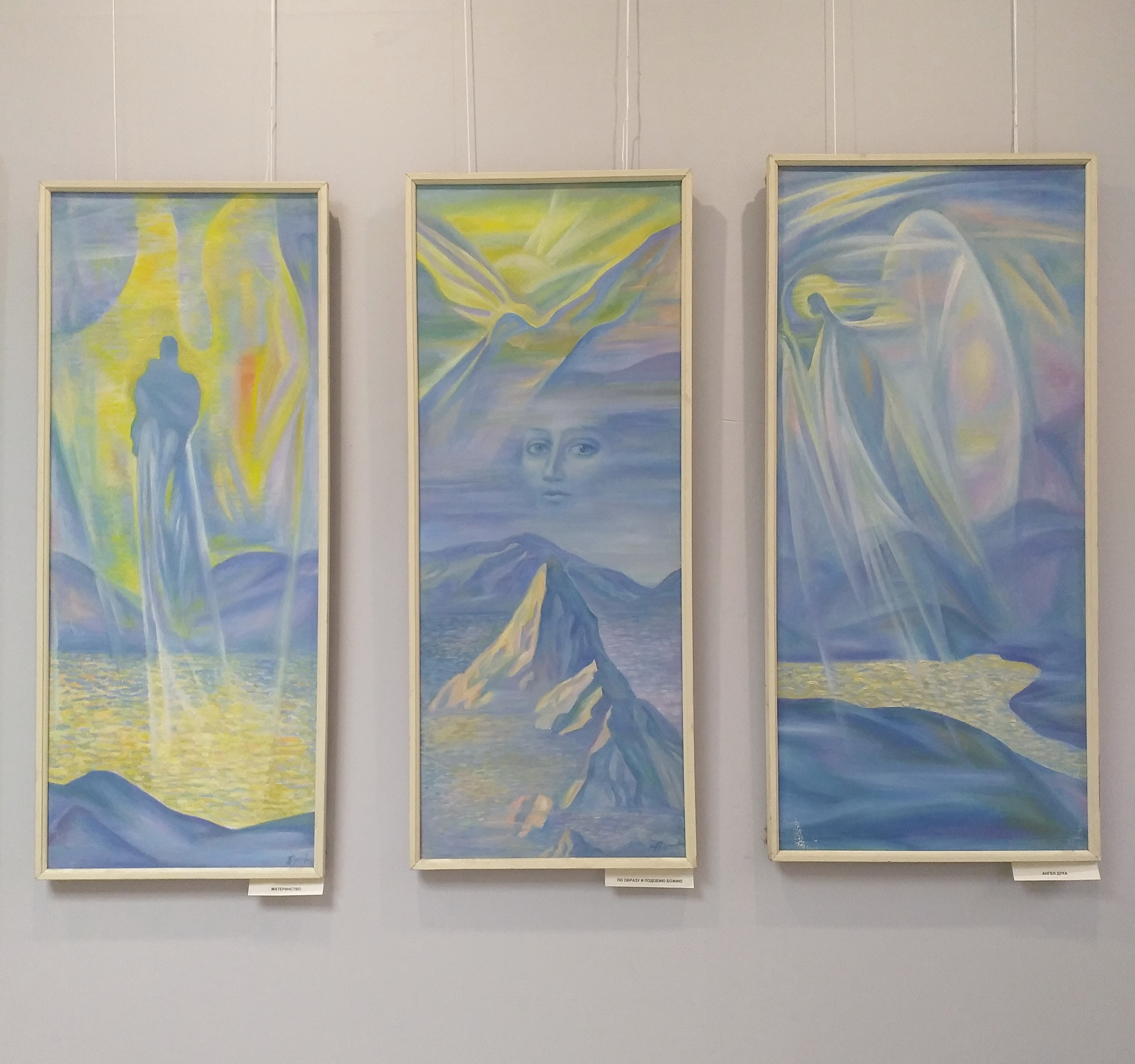 Зачастую в палитре преобладают всевозможные оттенки синего цвета. Он символизирует мистическое начало, Небо, Царство Божье. В философской серии работ «Материнство», «По образу и подобию Божьему», «Ангел духа», «Воскресение», приглушенный синий цвет идет рядом с желтым цветом. Желтый в данном контексте олицетворяет золотое сияние. Прозрачность цветовых слоев создает ощущение воздушности, эфемерности пространства, уводит зрителя в мир глубоких духовных переживаний.