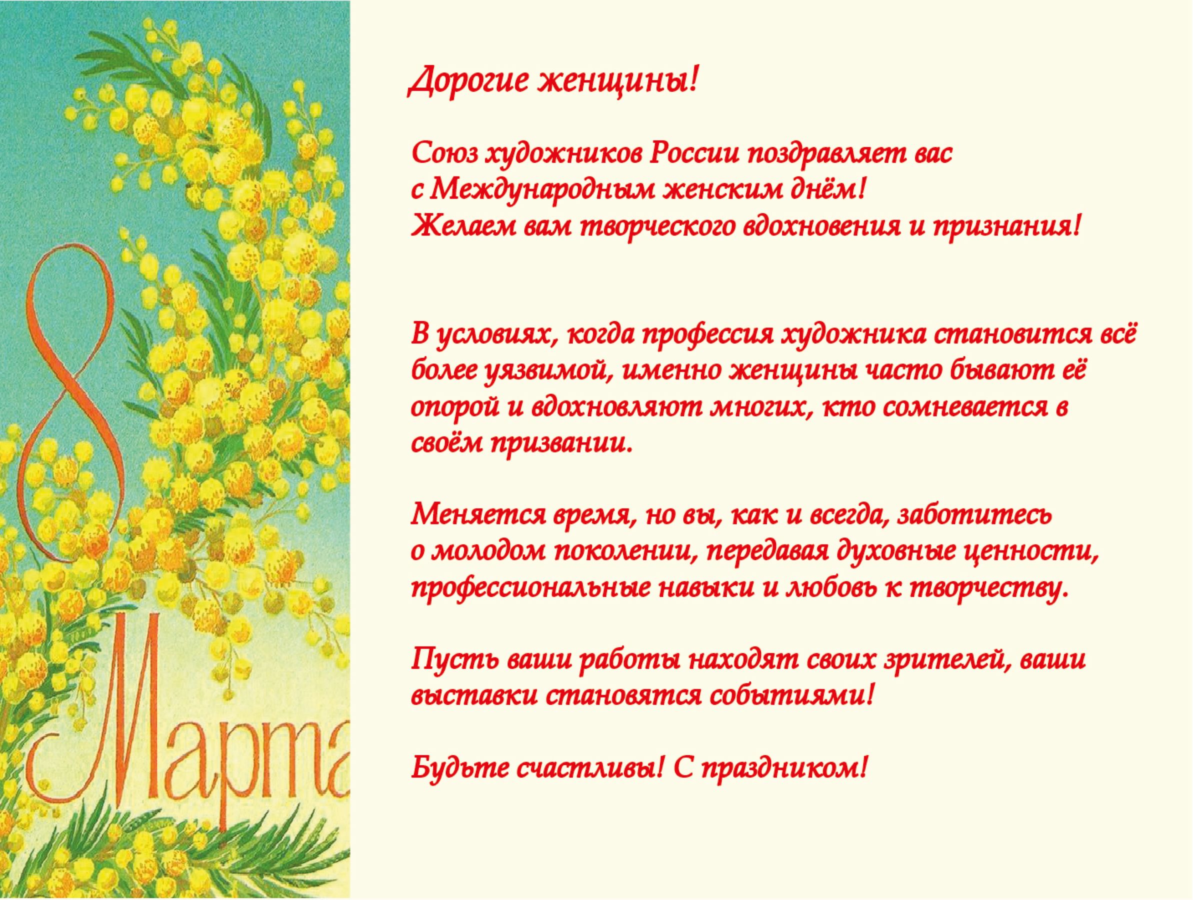 Союз художников России поздравляет женщин Союза с Международным женским днём! Творческого вдохновения и признания!